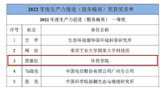 近日,中国生产力促进中心协会公布了2022年度全国“生产力促进奖”评选结果,金沙官网“中原学者”黄继红教授荣获2022年度生产力促进奖(服务精英)一等奖。