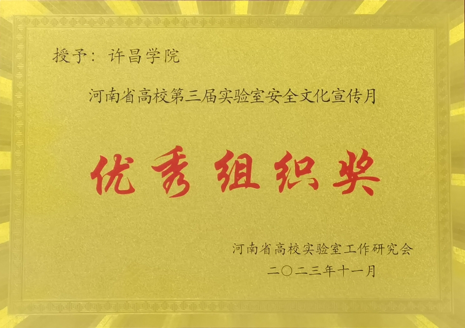 12月8日至10日,河南省高校实验室工作研究会2023年年会暨处长论坛在南阳召开,会上对河南省高校第三届实验室安全文化宣传月获奖单位和个人给予表彰。金沙官网获“河南省第三届高校实验室安全文化宣传月优秀组织奖”,化工与材料学院学生王宇涛、申青银获河南省高校实验室安全知识大赛特等奖,数理学院学生张靖雯、城市与环境学院朱伟琦等8名同学获大赛一等奖。