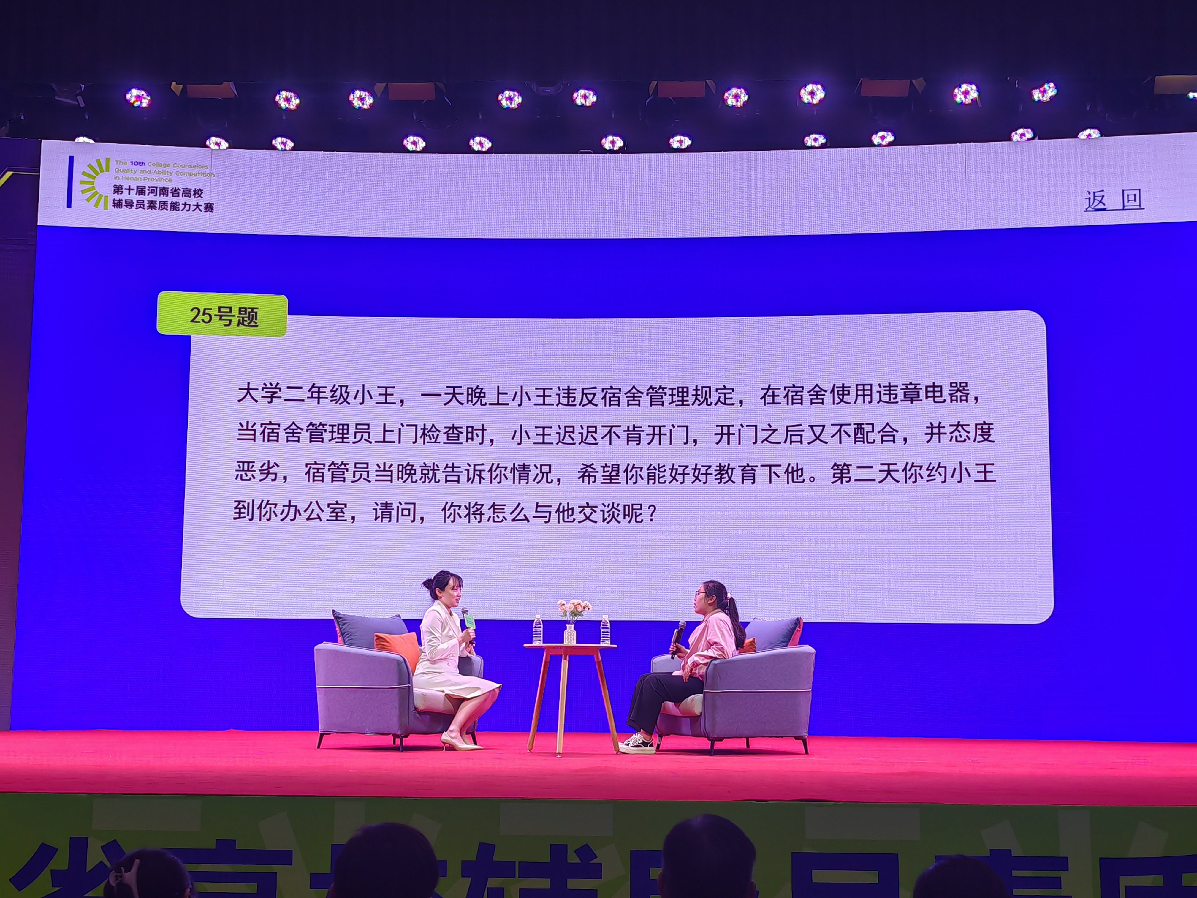 4月23日至24日,由中共河南省委教育工委、河南省教育厅主办,郑州航空工业管理学院承办的第十届河南省高校辅导员素质能力大赛顺利举行,来自全省高校的138名辅导员参加比赛。金沙官网数理学院辅导员仝婧在激烈的竞争中脱颖而出,荣获大赛“一等奖”。