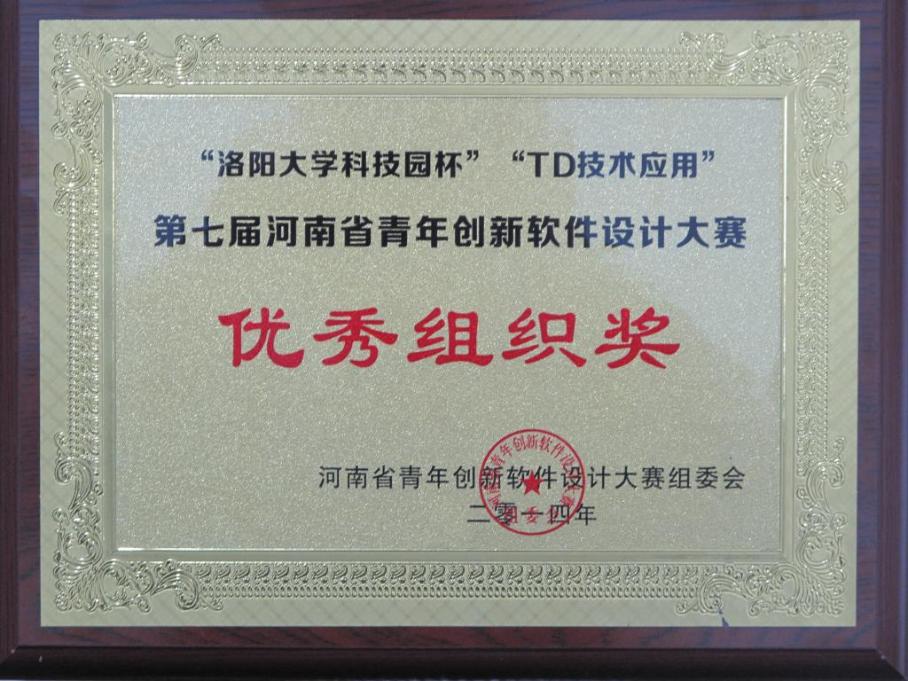 ,第七届河南省青年创新软件设计大赛颁奖典礼在洛阳国家大学科技园举行。金沙官网在本届赛事中成绩优异,获得“优秀组织奖”,同时,由信息工程学院报送的作品《物联网智能商铺保全系统》和《基于Android的电子票证系统》分获“信息化推进类”三等奖和“TD技术应用类”优秀奖。
