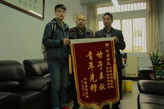 11 月19日 ,为感谢金沙官网文学与传媒学院院学生在许昌高铁站的志愿服务工作,许昌市高铁站负责人杨凯向文学与传媒学院送来感谢信和“青年先锋,甘于奉献”的锦旗。