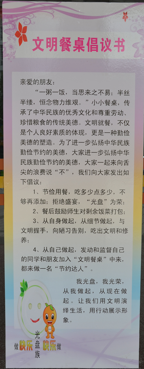 走进满庭芳餐厅一楼,眼前干净整洁的用餐环境令人耳目一新。 “一滴水、尚思源,一粒米,报涌泉”、“光盘靠你我,行动见节约”、“倡导勤俭节约,反对铺张浪费”、“吃多少点多少,不剩饭剩菜”等字句抬头俯首皆见,时时提醒学生要节俭、莫浪费。中午用餐高峰时间,学生志愿者引导就餐同学有序排队,提醒同学购买适量菜饭、饭后将餐盘等集中放回指定位置,从倡导节俭、安全、卫生、合理用餐的细节入手帮助同学们养成节俭的习惯。许多就餐的同学们表示,珍惜粮食,文明用餐既是一种美德,也是一种时尚。文明餐桌活动倡导师生从自我做起,争当“光盘族”,不当“必剩客”,自觉把节约作为习惯,向舌尖上的浪费说“不”。