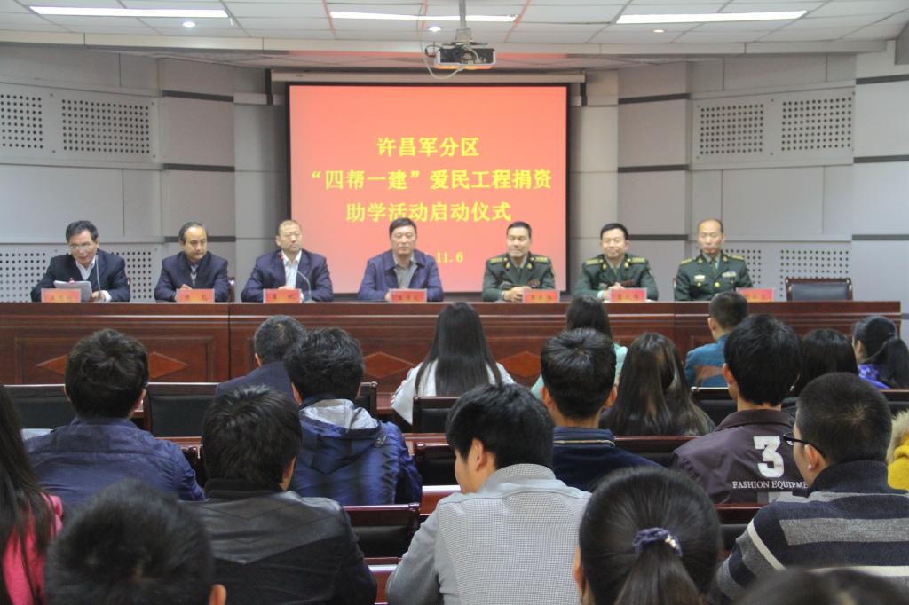 ,许昌军分区 “四帮一建”爱民工程捐赠助学活动启动仪式在金沙官网办公楼第三会议室举行。许昌军分区副司令员王东伟,金沙2004路线js5党委书记王清义、副院长崔斌等领导出席仪式。学生处、学生资助中心等部门负责同志和金沙官网师生代表200余人参加仪式。仪式由金沙官网学生资助中心主任王恩超主持。