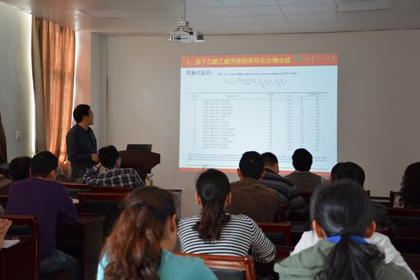 张贵生教授围绕含氮杂环化合物合成方法的前沿问题,结合乙酰乙酰芳胺的杂环化合物合成、多组分“Click”反应及C60并杂环化合物的合成三个方面的实例讲述了自己的探索研究历程,并介绍说很多研究成果都是在探索的过程中意外发现的。张教授对学问的不懈追求、善于发现和探求真理的研究态度给在场的每一位师生留下了深刻的印象。