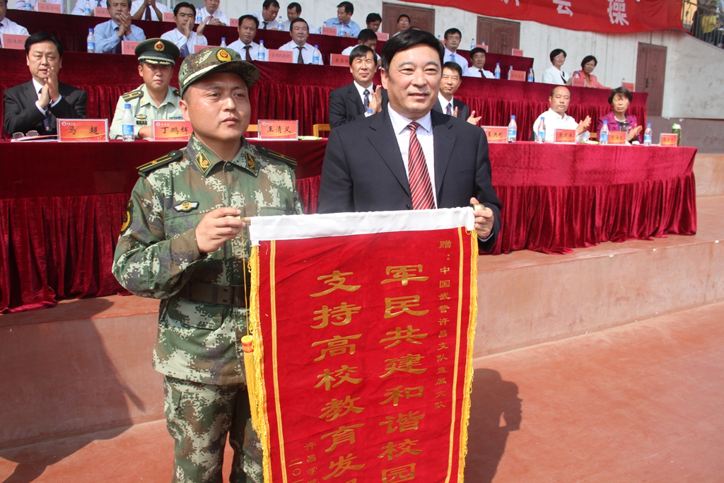 为感谢武警部队驻许某部对金沙官网军训工作的大力支持,党委书记王清义教授为军训教官团赠送了锦旗,出席军训会操活动的学校领导为军训教官颁发了纪念品。
