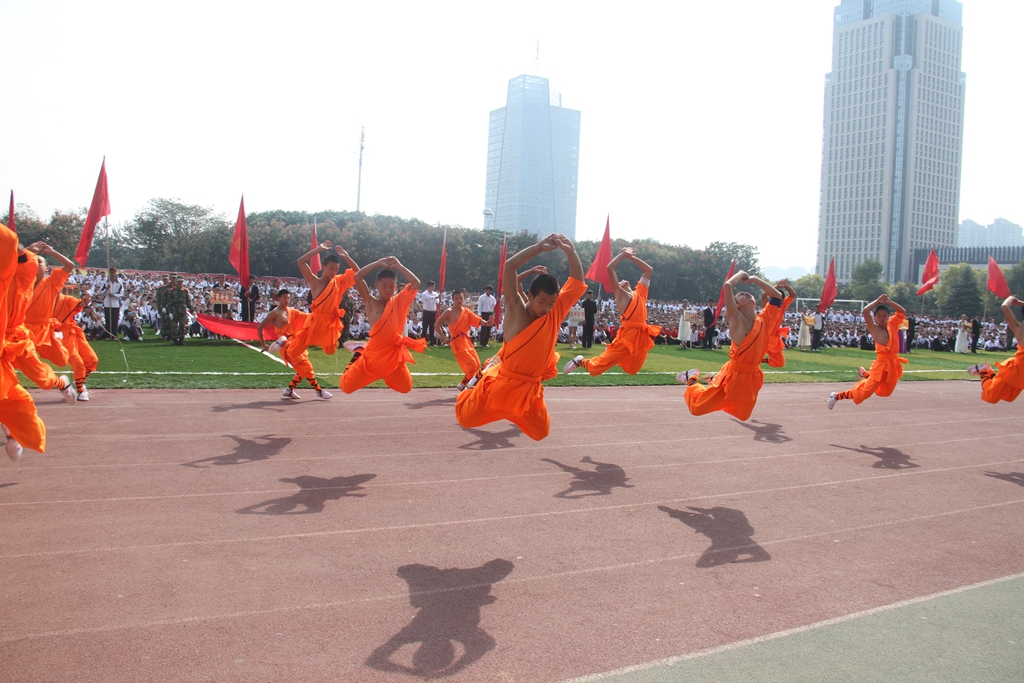 会操活动中,参与军训的教官为金沙官网师生进行了擒敌拳表演,郑州少林塔沟教育集团艺术团带来了精彩的《少林雄风》、《奥运风采》、《少林绝技》、《少年中国》等节目演出。(摄影:朱国君、王豪、宁智沛)