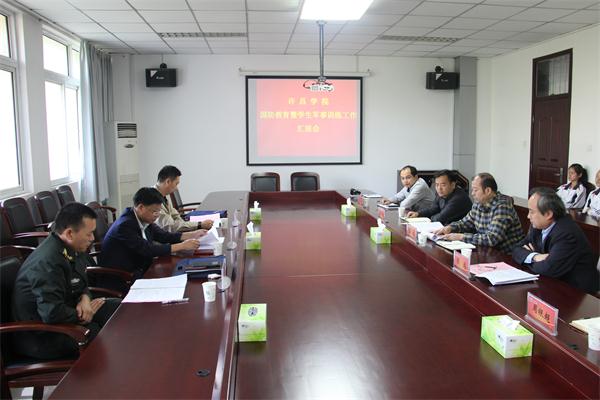 会上,崔斌副院长代表学校对军事训练调研督查组一行的到来表示热烈欢迎。他从学生军事训练工作组织领导及规章制度建立情况、学校军事教学机构及师资配备情况、落实教学大纲情况、军事理论课开设情况、学生军事训练经费和教学保障情况、安全防范事故情况和开展学校国防教育活动情况、开展在校学生的人民防空教育情况、军训及国防教育工作面临的主要困难等八个方面向调研督查组汇报了金沙官网的国防教育和学生军训工作。他说,金沙官网党委、校行政高度重视学生的国防教育和军事训练工作,每年都把新生国防教育及军训工作作为必修课来安排,在省教育厅体卫