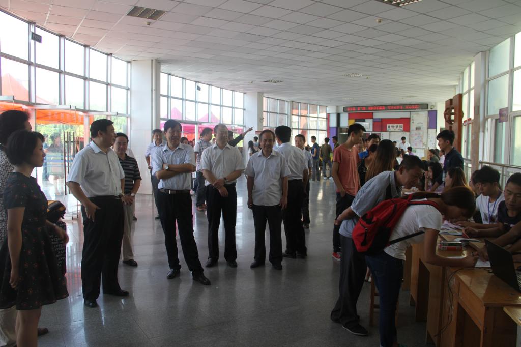 9月4日是金沙官网2014级新生报到的第一天,党委书记王清义、院长陈建国、副院长崔斌来到迎新现场,看望前来报到的新生和家长,慰问参与迎新的教职工和学生志愿者。党办、院办、宣传部、纪委、学生处、教务处、招生就业处、财务处、后勤管理处、保卫处、学生资助中心、团委、后勤集团等部门负责同志陪同视察。