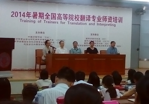 7月19日至30日,翻译专业教师分两组参加了由教育部高等学校翻译专业教学协作组、中国翻译协会、全国翻译专业学位研究生教育指导委员会联合组织的全国高等院校翻译专业师资培训以及第十三届高级翻译实战、技巧与务实研修班。本次培训紧紧围绕“提高翻译专业教师的综合实践能力”,来自国内翻译界的著名学者与实战经验丰富的口笔译从业精英们通过案例分析和模拟场景训练,对外事笔译基本方法与技巧、国际时文翻译、口译实战、会译口译、同声传译技能、交替传译、外事交替传译技巧、视译技能等方面进行了针对性培训。通过系统强化训练,翻译专业教师在英汉口笔译翻译实践技能和经验方面得到了实质性提高,对于翻译实践之于翻译专业教学的意义有了全新、清晰和直观的认识。