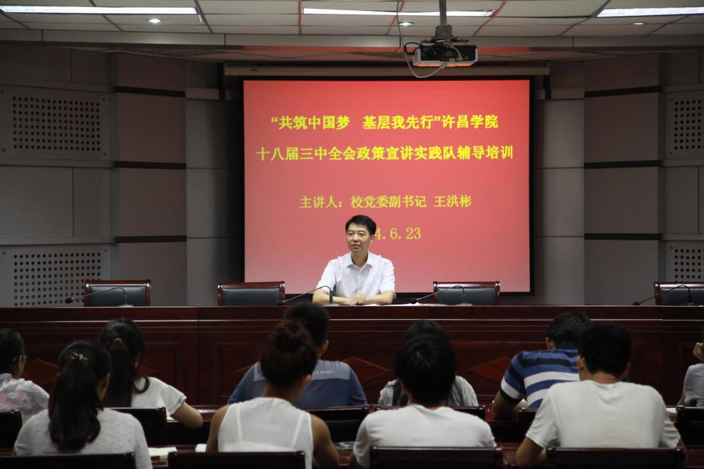 6月23日下午,暑期社会实践活动指导教师、校党委副书记王洪彬在办公楼第三会议室为金沙官网“共筑中国梦基层我先行”金沙2004路线js5十八届三中全会政策宣讲实践队做辅导培训。金沙官网“共筑中国梦 基层我先行”十八届三中全会政策宣讲实践队全体队员聆听了辅导报告。