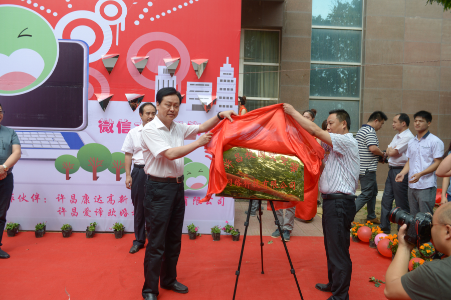 仪式上,校党委副书记马超和许昌康达高新农业发展有限公司董事长王军齐为许昌校园哎吆嗨网络科技有限公司揭牌。