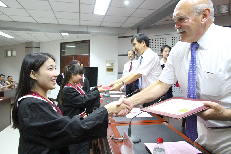 毕业典礼仪式上,Brian McMiIlan院长为2014年度荷兰学院奖学金获得者李晶晶、张文同、姜珊颁发了奖学金。
