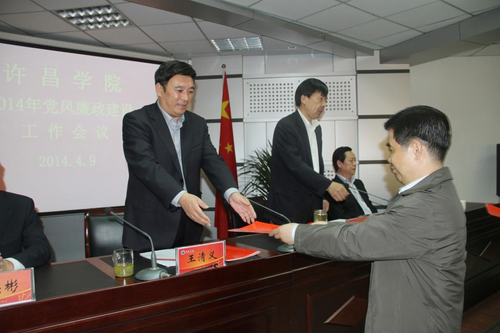 党风廉政建设工作会议上,各单位党组织负责人签订了《党风廉政建设责任书》,并向党委书记王清义、院长陈建国递交了《党风廉政建设责任书》。(摄影:朱国君)