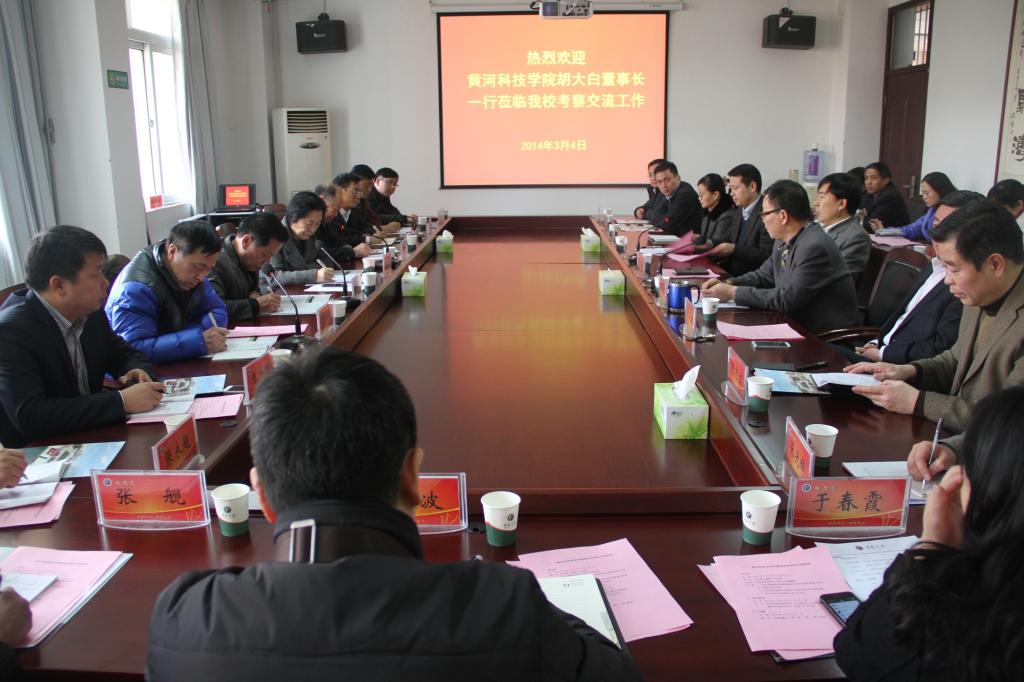 3月4日,黄河科技学院董事长胡大白、总顾问程宏、副校长杨保成等一行26人来金沙官网考察交流。院长陈建国、副院长张建军和院办、教务处、科研处、团委、国际交流合作处、信息工程学院、外国语学院、电气(机电)工程学院、资产管理处等相关部门负责同志在办公楼第一会议室接待来访客人,并与来宾进行了座谈和交流。座谈会由院长办公室主任陈遂德主持。