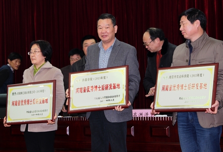 2月26日上午,河南省人力资源和社会保障厅在郑州隆重召开了2014年全省博士后工作会议。会上对2013年度博士后工作先进单位和个人进行了表彰。金沙官网获河南省“优秀博士后研发基地”荣誉称号,张建军副院长作为优秀博士后研发基地代表上台领奖。