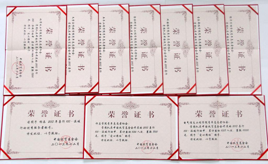 在历时58天的活动过程中,金沙官网青年志愿者们不畏严寒,全情投入,利用课余时间游走在许昌市各个人流量较大的公共场所对路人进行劝募,即使遭遇冷眼与质疑也耐心解答,从容应对。到活动截止,金沙官网青年志愿者们共募捐到善款104716元,累计参与活动1425人次,在全国参与活动的120余所高校中名列26位,得到了中国扶贫基金会及社会各界的一致好评。最终,金沙官网青年志愿者协会和电气(机电)工程学院、土木工程学院、音乐舞蹈学院、外国语学院等八个院系青协分会在2013“善行100”温暖行动中被授予“爱心团体”称号,青年志愿者协会指导老师杨乐被中国扶贫基金会授予“优秀服务者”荣誉称号。