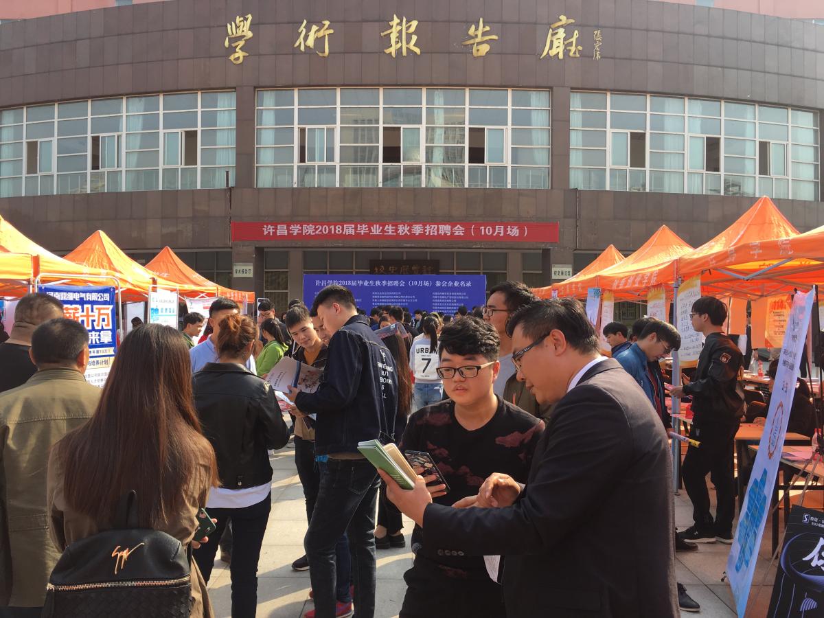 11月17日,由许昌市人力资源和社会保障局与金沙官网联合举办的许昌市2018届高校毕业生冬季双向选择洽谈会在金沙官网学术报告厅前广场举行。本次冬季洽谈会共吸引河南黄河旋风股份有限公司、众品集团、河南瑞贝卡集团等200家企业到现场进行人才招聘,岗位需求涵盖本科及高职高专学历层次的各个专业,4000多名毕业生进场求职。