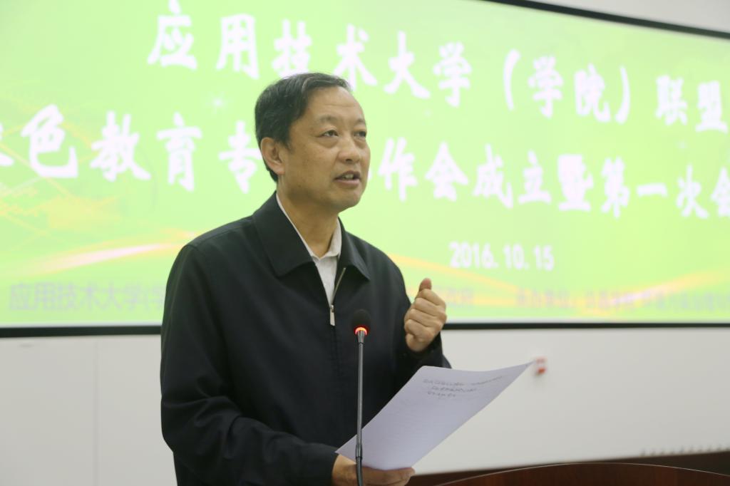 应用技术大学(学院)联盟理事长孟庆国宣读了《关于同意成立应用技术大学(学院)联盟绿色教育专业协作会的决定》并致辞。他说,联盟的二级专业协作会,要在教育部学校规划建设中心的领导下,力促中国应用技术类型大学转型,为国家培养应用技术的人才。与会的专家、学者的讨论和学术交流,将为带动中国应用型高校的绿色教育人才培养及就业,为中国绿色企业走向世界贡献力量。