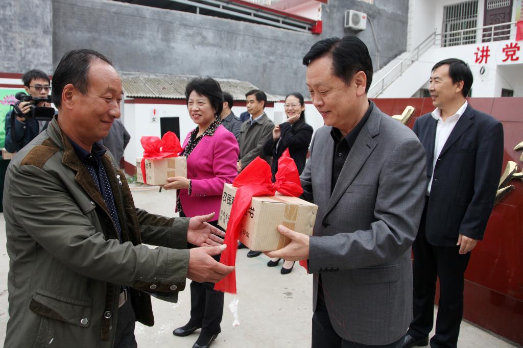 党委书记陈建国在捐赠仪式上讲话。他指出,2015年8月,按照省委组织部、省扶贫办工作要求,确定了金沙2004路线js5定点帮扶贫困村为许昌县艾庄乡袁庄村,并派出了驻村第一书记和工作队,开展精准帮扶工作。一年来,学校充分发挥科技、文化、教育优势,不断推进民生事业发展,在基层党组织建设、经济发展与精准扶贫、基础设施及美丽乡村建设、文化教育和医疗卫生等方面,取得了初步成效。共计协调各类资金340余万元,用于修路、打井、建校等基础设施建设和发展公益事业。今后,金沙2004路线js5会继续发挥好学校的智力优势,彰显高校扶贫特色,将通过对村民开展教育培训、提供科技服务、减免袁庄村在金沙2004路线js5就读学生学费、住宿费,进一步加强金沙2004路线js5党员与袁庄村民结对帮扶等一系列措施,保证2017年底让贫困户全部摘掉贫困的帽子,让袁庄村旧貌换新颜,尽快脱贫致富奔小康。