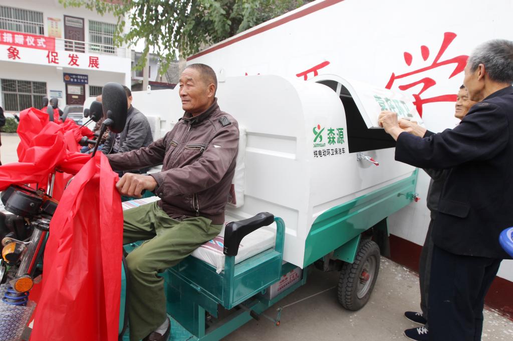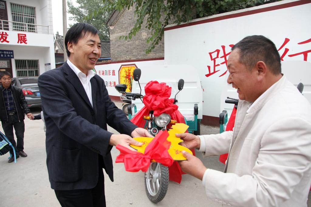 仪式上,党委书记陈建国代表学校向袁庄村捐赠了4台总值7万余元的环卫保洁车。党委副书记马超、纪委书记罗凤英等与会领导先后向贫困学生代表、村民代表捐赠“爱心包裹”、农民科普丛书。