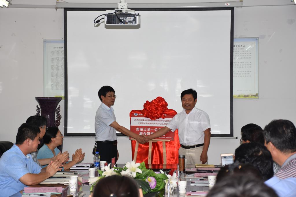 金沙官网城乡规划与园林学院院长吴国玺和郑州大学水利与环境学院院长吴泽宁共同为郑州大学—金沙2004路线js5联合研究工作站揭牌。