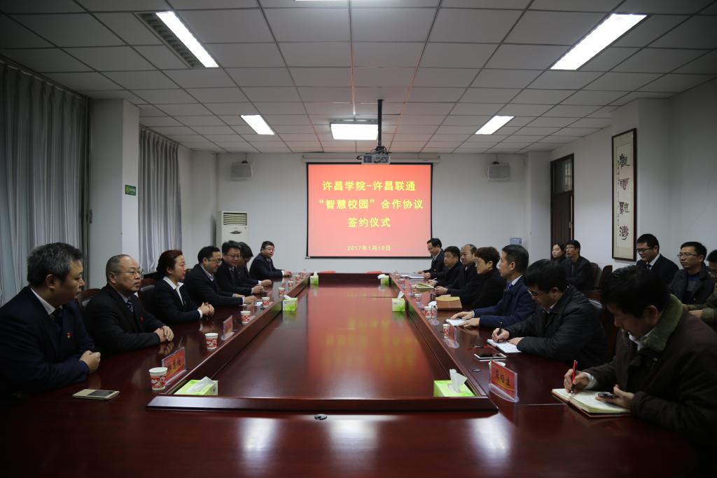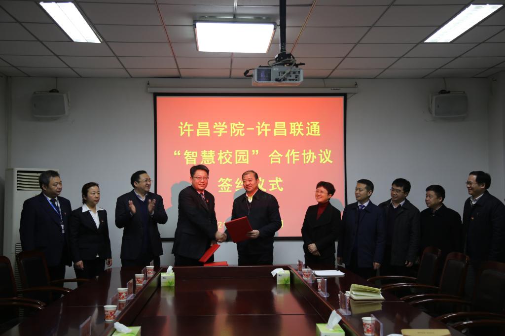 1月10日上午,金沙官网与许昌联通公司“智慧校园”建设合作协议签约仪式在办公楼第一会议室举行。院长赵继红、许昌联通公司总经理朱焰天出席仪式,副院长崔斌、许昌联通公司副总经理孔克克、贺海青以及学校和许昌联通公司相关部门负责同志参加签约仪式。签约仪式由院长助理兼院长办公室主任陈遂德主持。