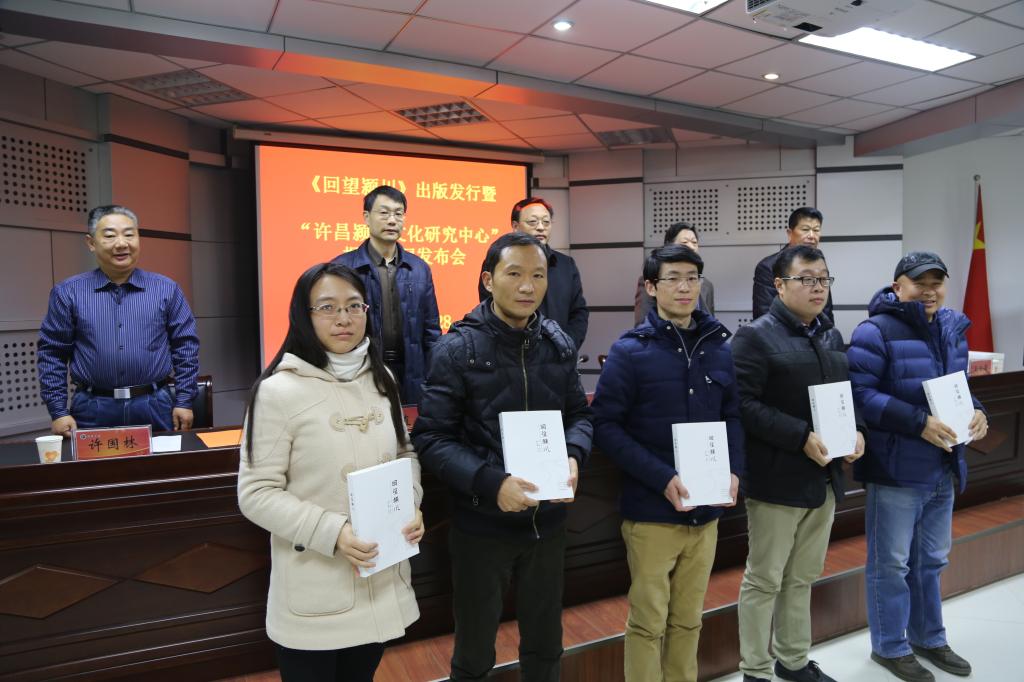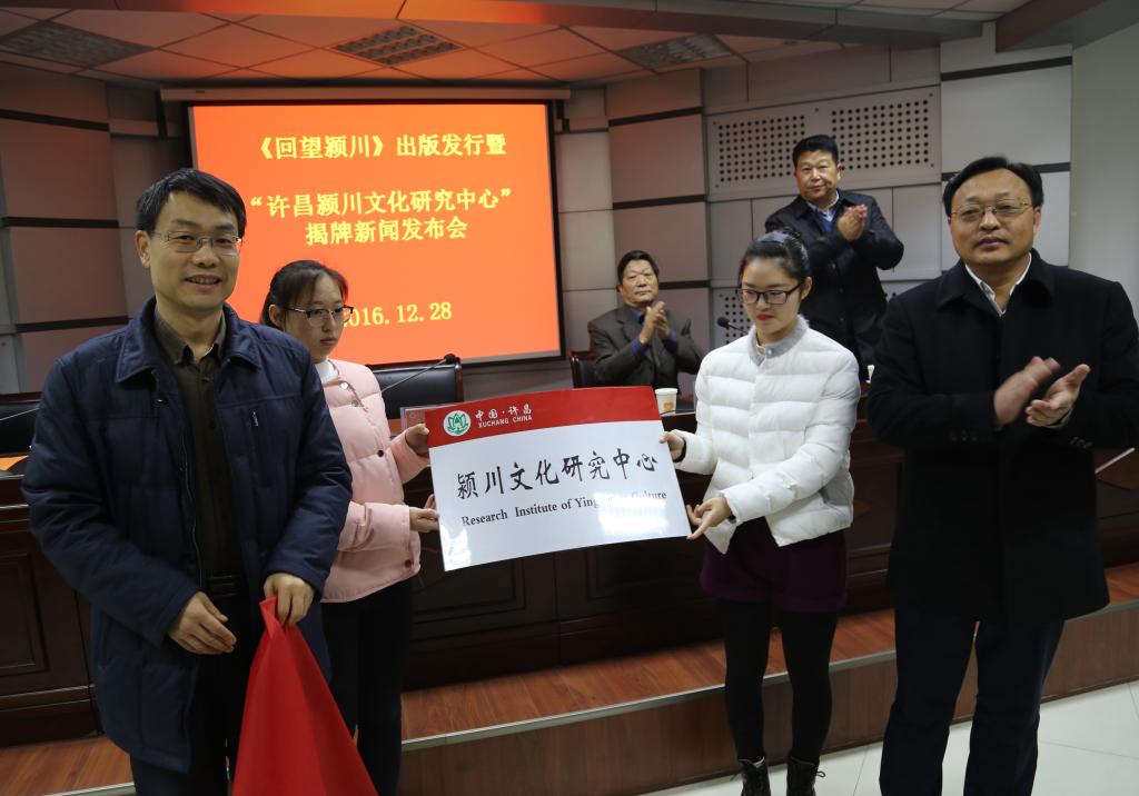 与会领导向许昌颍川文化研究中心的研究人员分别赠送新书《回望颍川》,许昌市委常委、统战部部长刘保新和金沙2004路线js5副院长郑直共同为“许昌颍川文化研究中心”揭牌。