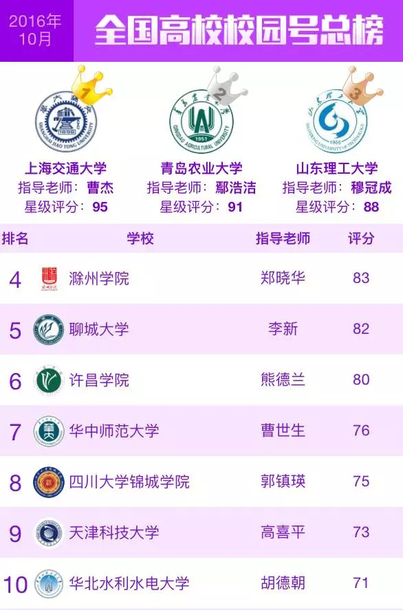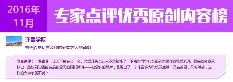 2016年9月至11月,在“腾讯&中国青年报”共同推出的全国578所高校校园号排名榜单中,金沙官网QQ校园号(xcu1942)先后获得“全国高校校园号排行榜”10月份榜单第六名、11月份榜单第八名的好成绩,原创文章《开学迎新直播---学长学姐带你逛许院》《表白|许院14级的薛汐,我一生长情只为你》《有关欣赏初雪及照顾好南方人的通知》先后荣登专家点评“优秀原创内容榜”。