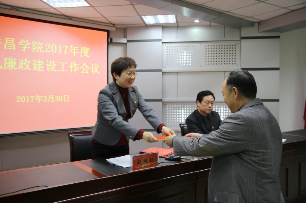 党委副书记、院长赵继红在会上讲话。她说,要做好党风廉政建设工作,我们各级领导干部要做到履职尽责、不忘初心、砥砺前行。一是党委要切实担负起全面从严治党的主体责任。党的各级组织要自觉把管党治党、从严治党责任扛在肩上,牢固树立抓好党建是本职、不抓党建是失职、抓不好党建是渎职的责任意识。要强化“党政同责”、“一岗双责”,真正做到党委“不放手”、主要领导“不甩手”、班子成员“不缩手”、纪委“不松手”。严肃考核问责,健全完善考核评价制度,严格落实《中国共产党问责条例》。二是纪委要切实担负起全面从严治党的监督责任。校党委将全力支持纪检监察部门持续深化“三转”,确保纪检监察部门聚焦主业依纪依法履行职责。纪检监察部门要切实履行监督职责,突出监督重点,强化监督检查,加强落实中央八项规定精神及省委省政府若干意见规定的日常检查和年节假期的重点抽查,对查出的问题决不姑息。三是作风建设要常抓不懈,久久为功。要以解决“四风”问题为突破口,持续发力,久久为功,坚决把积弊旧习清除掉,使党的作风全面过硬。要把作风建设拓展延伸到教学、科研、管理服务等各个领域,融入党的建设的各项工作;要加强师德师风建设,继续开展“强师德、练师能、正师风、铸师魂”活动,进一步完善师德考评机制,增强广大教职工的职业操守;要进一步强化党政管理人员服务意识、廉洁意识,规范权力运行,坚决破除衙门作风,以优良的党风带师风,转教风,引学风,促校风。