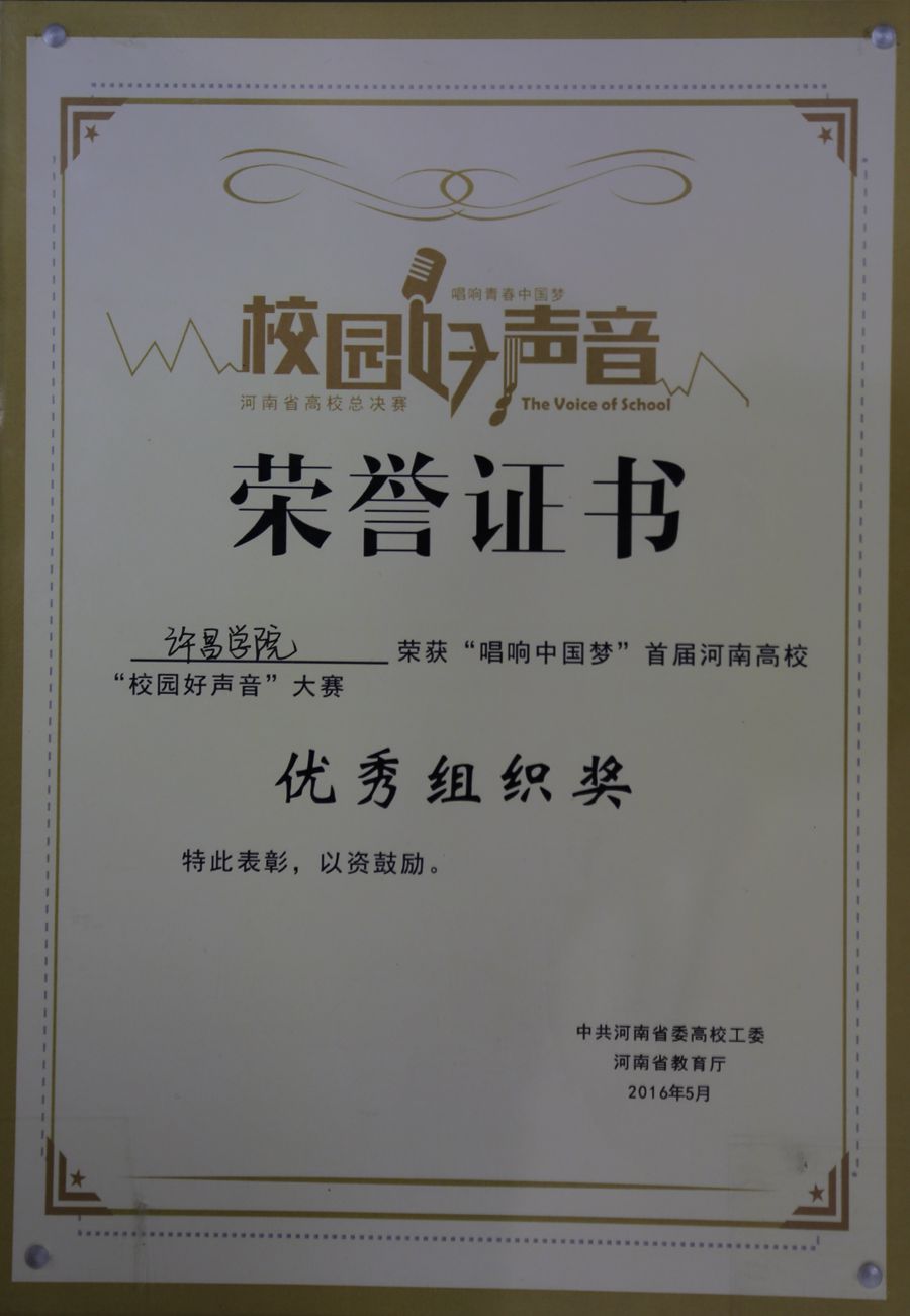 6月1日,中共河南省委高校工委办公室、河南省教育厅办公室下发《关于公布第二届全国高校“校园好声音”大赛河南省高校决赛的获奖结果的通知》(教办思政〔2016〕323号),金沙官网荣获优秀组织奖,金沙官网音乐舞蹈学院张锋锋老师获得优秀指导教师奖。