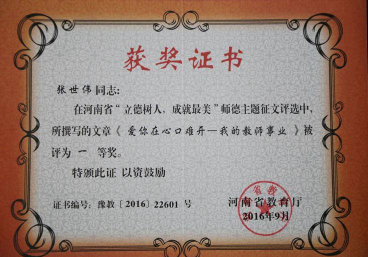 9月27日,河南省教育厅下发了《关于公布“立德树人,成就最美”师德师风案例征文评选和演讲比赛结果的通知》(教师〔2016〕752号),金沙官网张世伟老师撰写的文章《爱你在心口难开——我的教师事业》荣获一等奖,王武老师撰写的文章《老师,我要和您一起去看海》荣获二等奖,张学燕老师撰写的文章《继承传统文化立足校园文化注入高校师德建设新内容》荣获三等奖。