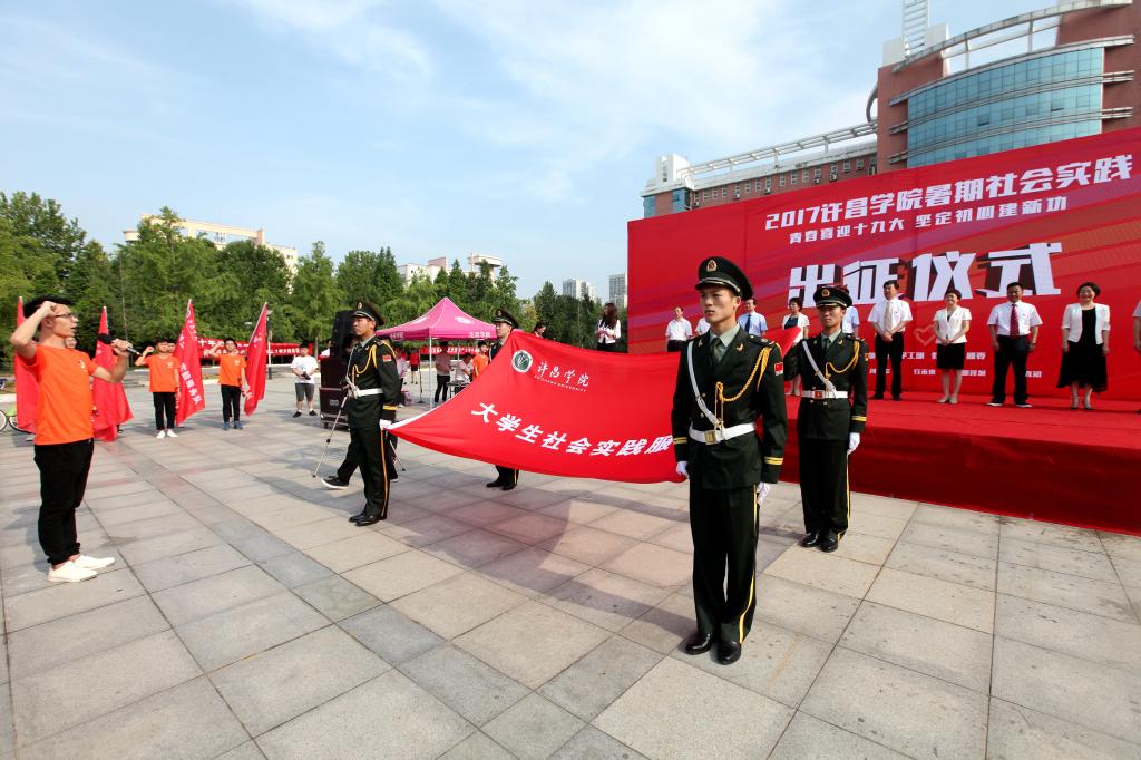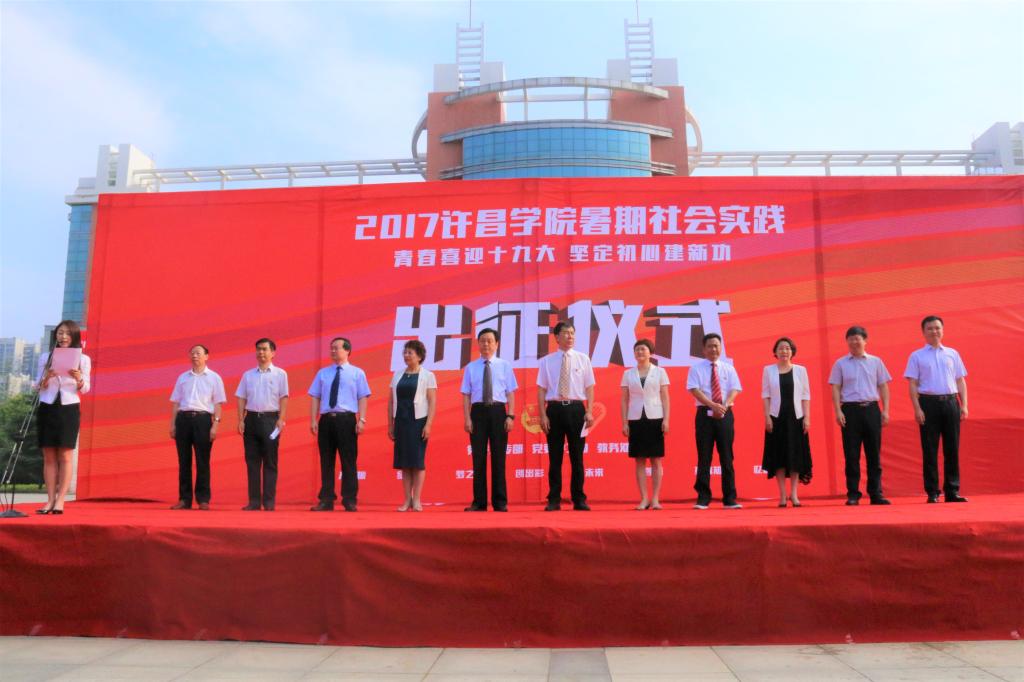 6月29日上午8点,金沙官网2017年“青春喜迎十九大·坚定初心建新功”大学生暑期社会实践活动出征仪式在弘毅广场举行。校党委书记陈建国,院长赵继红,党委副书记马超、孙海,纪委书记罗凤英,副院长黄怡俐、郭涛,许昌团市委书记陈涛等出席仪式。河南大森机电股份有限公司董事长赵晓东、河南瑞贝卡发制品股份有限公司人力资源部部长陈玲杰、许昌蓝天救援队队长蒋耀军作为金沙官网大学生社会实践活动合作单位代表莅临现场。各二级学院党总支书记、副书记、团总支书记,实践团队指导老师和社会实践学生代表近1200人参加仪式。出征仪式由团委书记谢依楠主持。