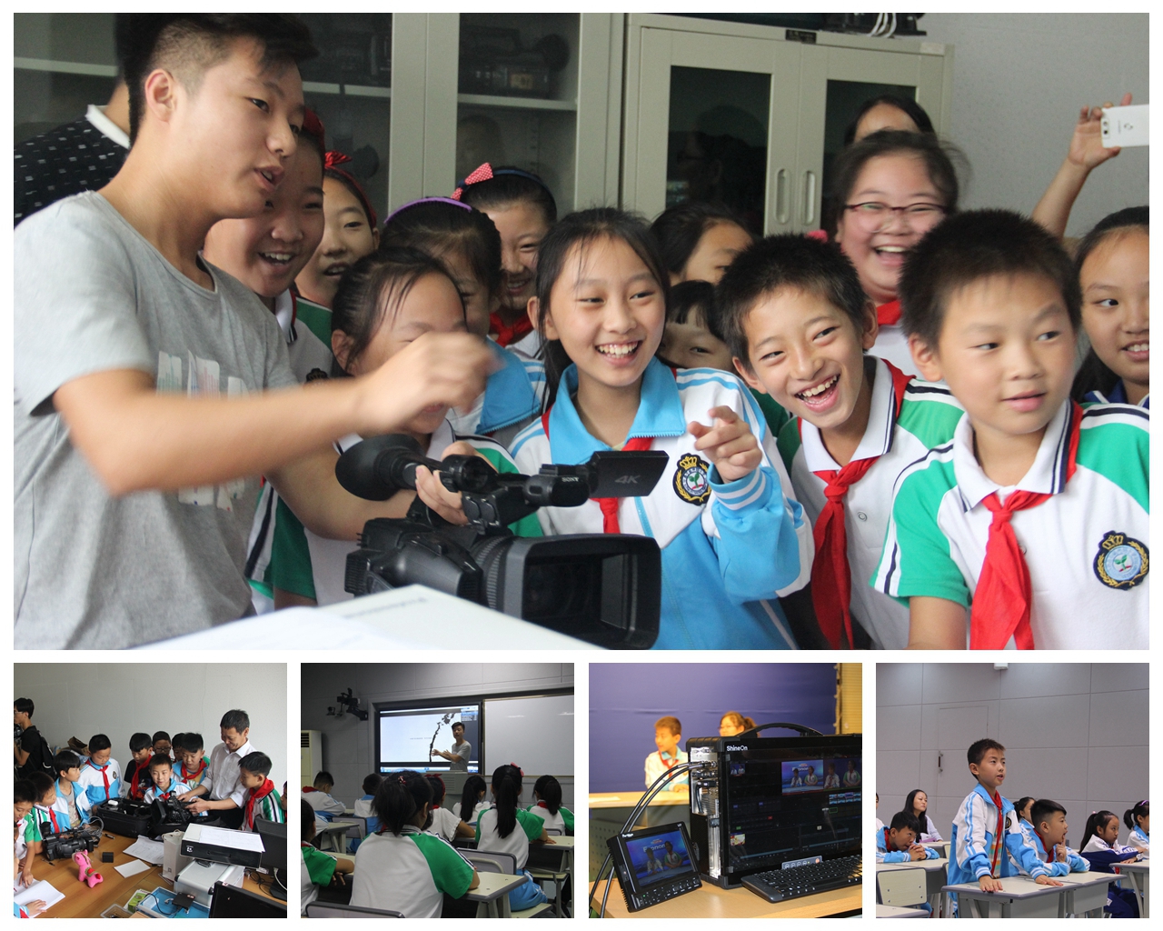 小学生们观看了由我基地创作的两部科普微电影《许小科历险记之游泳安全课》和《许小科历险记之智斗火魔》,网络电视台的学生记者为他们讲解了摄影的基本知识与无人机拍摄相关知识,在小型演播室,小学生们了解了电视节目制作的基本原理与流程,每名同学都走上主播台,体验了一把当主持人的感觉。本次活动既是一场影视科普教育体验活动,更是一次“大手拉小手”的科技教育实践。
