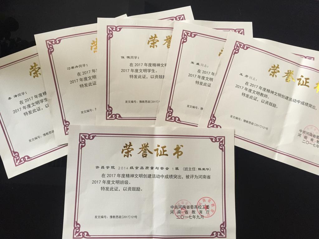 在全省教育系统2017年度精神文明建设先进集体和先进个人的评选工作中,金沙官网2014级食品质量与安全1班(班主任:陈荣华)被评为“河南省2017年度文明班级”;党委宣传部王彦、美术学院国画教研室宋威两名教师被评为“河南省2017年度文明教师”;2014级工商管理(会计方向)1班李泽、2014级汉语语言文学2班刁若卉、2015级数学与应用数学1班伍慢三名同学被评为“河南省2017年度文明学生”。