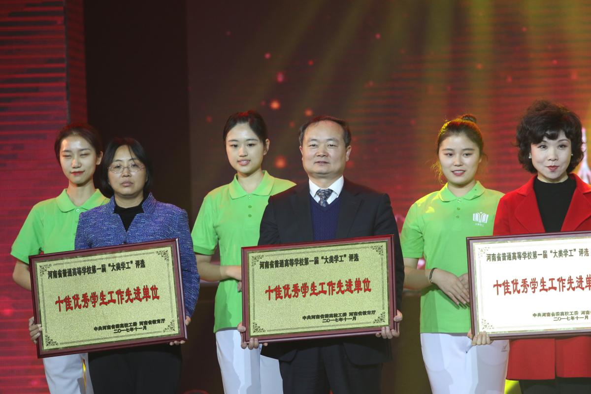 11月28日,由省高校工委、省教育厅主办的河南省普通高等学校第一届“大美学工”颁奖典礼在河南大学举办,河南省委高校工委书记、省教育厅厅长朱清孟,省教育厅副巡视员李金川,河南省教育厅学生处长王继东等出席典礼,并为获奖单位、个人和品牌颁奖。
