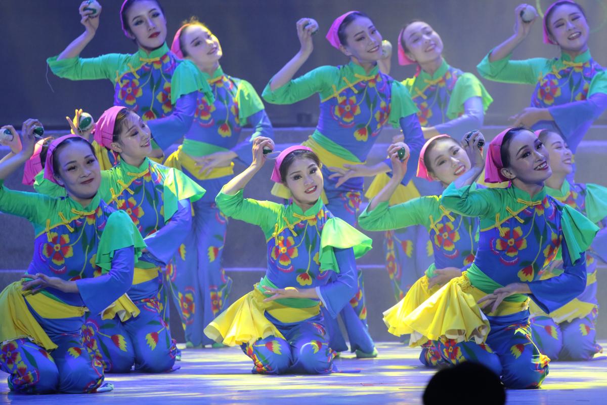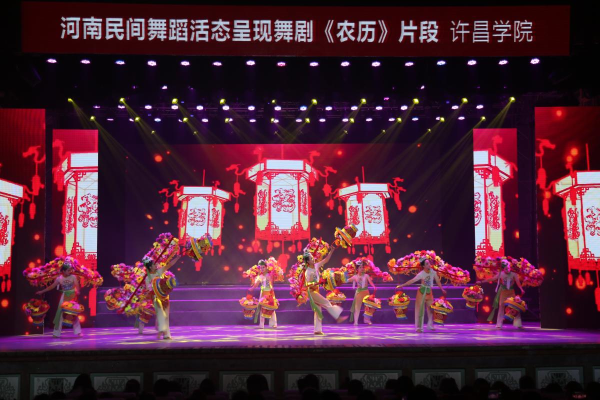 河南民间舞蹈活态呈现舞剧《农历》(片段)在河南大学大礼堂参加现场展演,图为花挑舞