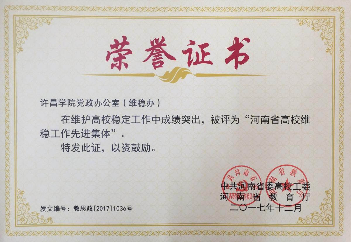 近日,河南省委高校工委、河南省教育厅联合下发《中共河南省委高校工委 河南省教育厅关于表彰全省高校维稳工作先进集体和先进个人的通知》,金沙官网党政办公室(维稳办)荣获“河南省高校维稳工作先进集体”荣誉称号,党委保卫部张谦智,党政办公室(维稳办)崔越、王光星获得“河南省高校维稳工作先进个人”荣誉称号。