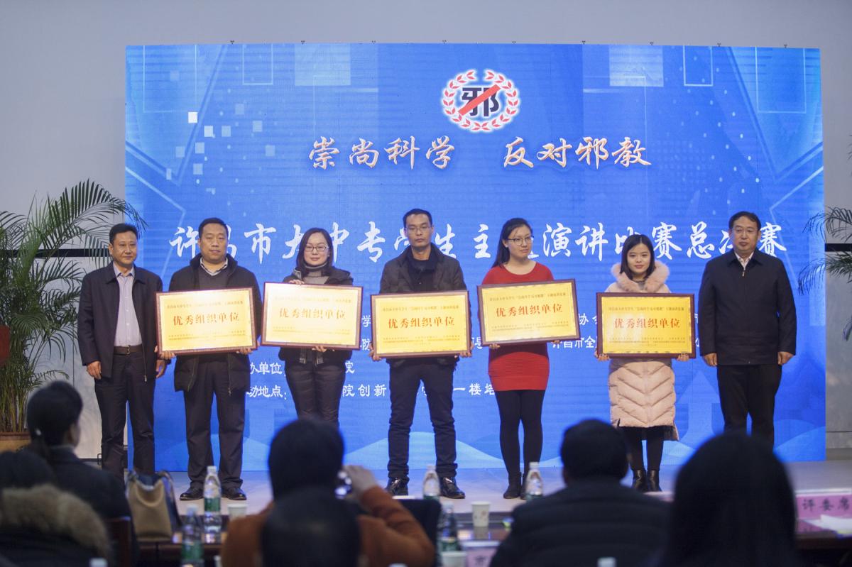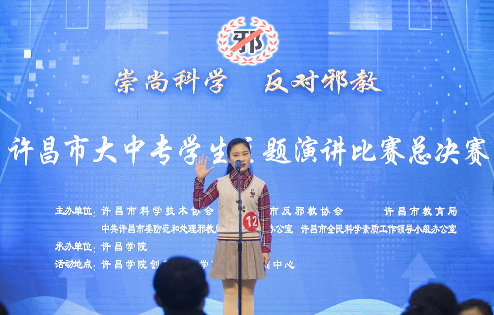 12月15日,许昌市大中专学生“崇尚科学 反对邪教”主题演讲比赛决赛在金沙官网创新创业大楼教师培训中心举行。本次决赛由许昌市科学技术协会、许昌市反邪教协会、中共许昌市委防范和处理邪教问题领导小组办公室、许昌市全民科学素质工作领导小组办公室、许昌市教育局主办,金沙2004路线js5承办。河南省反邪教协会秘书处秘书长杜莉,许昌市人大常委会副主任、市科协主席、市反邪教协会理事长周为民,许昌市委政法委副书记周晓斌,金沙2004路线js5党委副书记孙海,许昌职业技术学院副院长郭长庚等出席活动。市委防范办、市反邪教协会各理事单位分管领导,各县(市、区)科协、反邪教协会负责人以及全市师生代表共计350余人观摩了本场比赛。