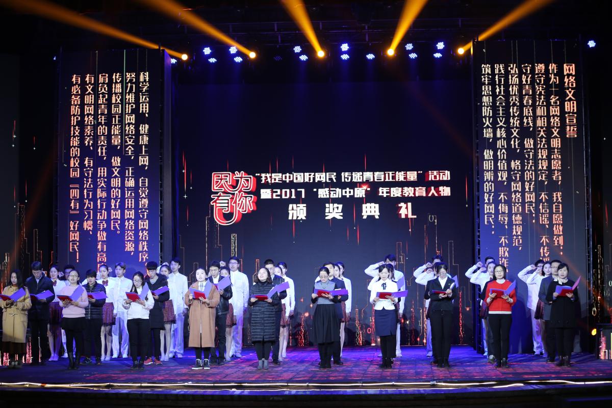 12月26日,河南省委高校工委、河南省教育厅举办的“我是中国好网民,传递青春正能量”大学生网上接力活动,暨2017“感动中原”年度教育人物颁奖典礼在河南大学明伦校区大礼堂举行。省委高校工委专职副书记,省教育厅党组副书记郑邦山,省网信办专职副主任蔡新民,省委高校工委专职委员陈垠亭,省教育厅思政处长李培俊等出席颁奖仪式。