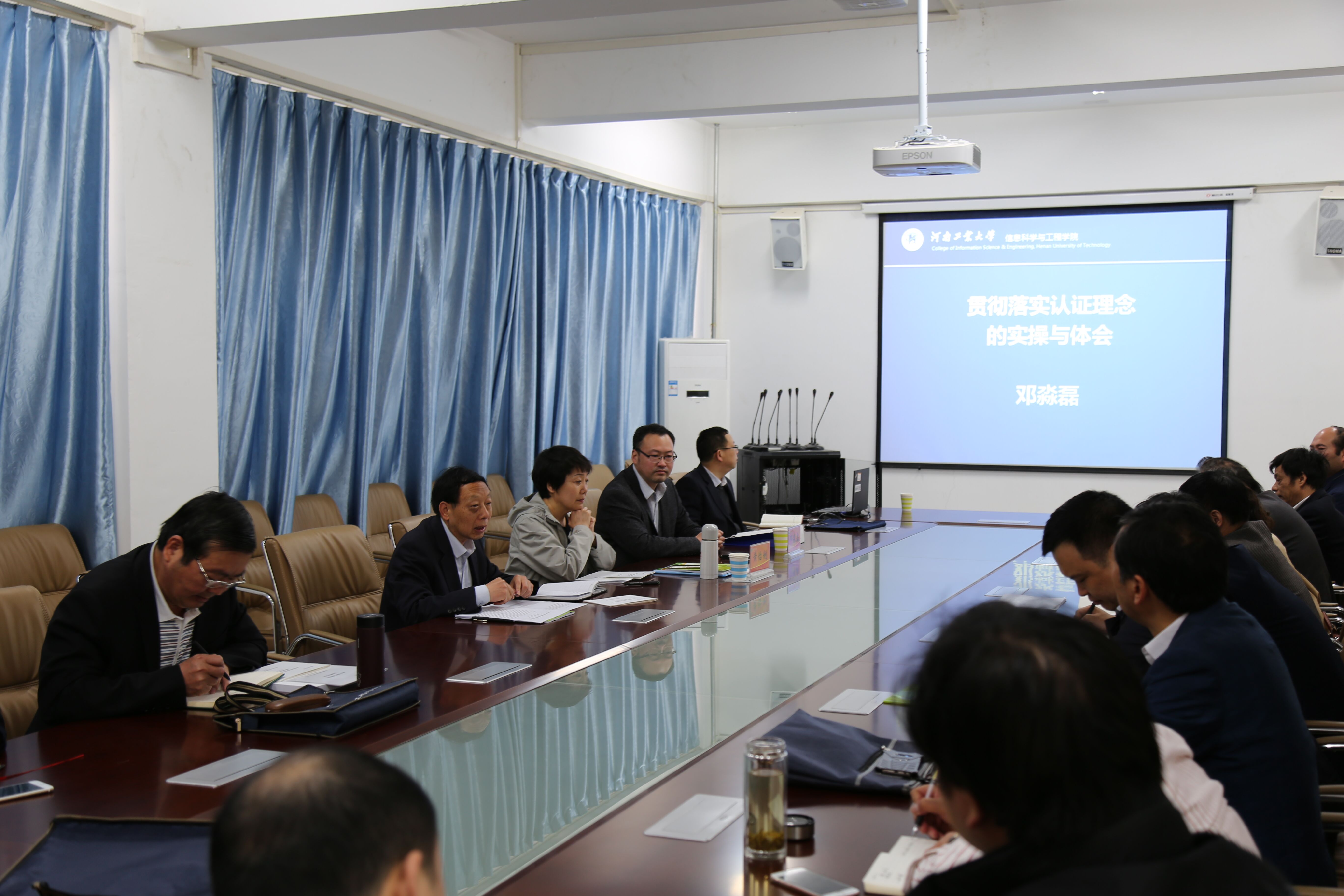 4月16日上午, 金沙官网在创新创业学院一楼会议室举行工程教育专业认证专题报告会。会议邀请河南工业大学信息科学与工程学院副院长邓淼磊教授作专题辅导报告。副院长黄怡俐出席会议,教务处、科技处、人事处、学生处、招生办公室等相关职能部门负责人,电气(机电)工程学院、化学化工学院、土木工程学院、外国语学院、体育学院、马克思主义学院、创新创业学院、公共实验中心等单位负责人及认证工作相关人员参加了会议。会议由教务处处长周颖杰主持。