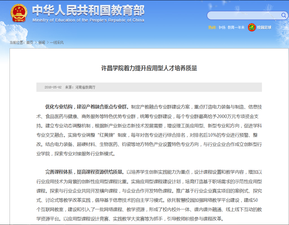 5月2日,教育部官方网站刊载文章《金沙2004路线js5着力提升应用型人才培养质量》,该文从“优化专业结构,建设产教融合重点专业群”“完善课程体系,提高课程资源供给质量”“突出能力导向,深化人才培养模式改革”“探索多元评价,深化评价体系改革”四个方面介绍金沙官网应用型人才培养工作。