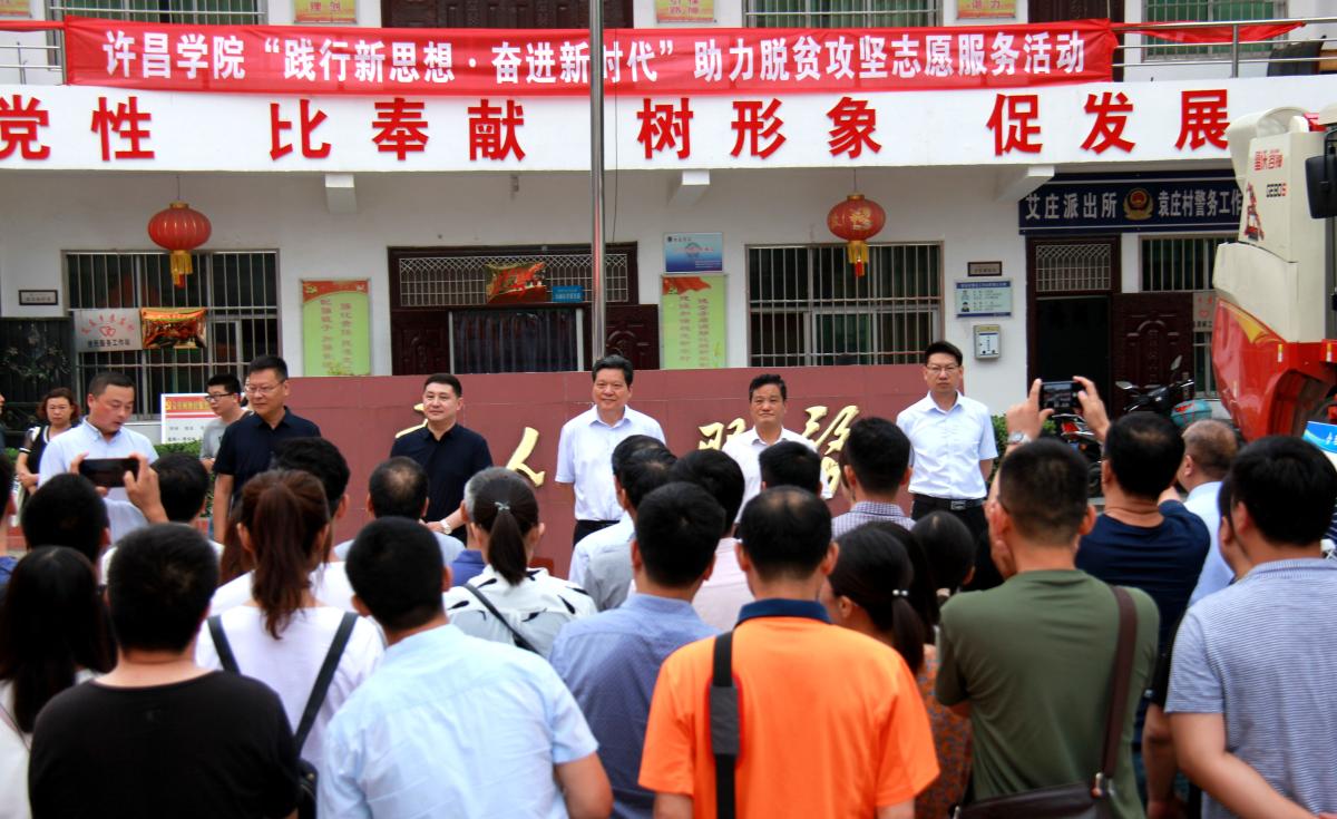 6月26日上午,由校工会组织的“践行新思想·奋进新时代”——助力袁庄村脱贫攻坚教职工志愿服务活动启动仪式在金沙官网对口帮扶村建安区艾庄回族乡袁庄村举行。校工会主席高金星,党委组织部长陈遂德、建安区武装部政委李发扬、群工部部长李书正、艾庄回族乡党委书记刘迎君、乡长刘文奇等出席启动仪式,建安区区乡帮扶负责人、袁庄村两委班子成员和金沙官网承担志愿服务项目的相关分工会负责人、志愿者代表100余人参加启动仪式。仪式由金沙官网驻袁庄村第一书记陈浩勇主持。