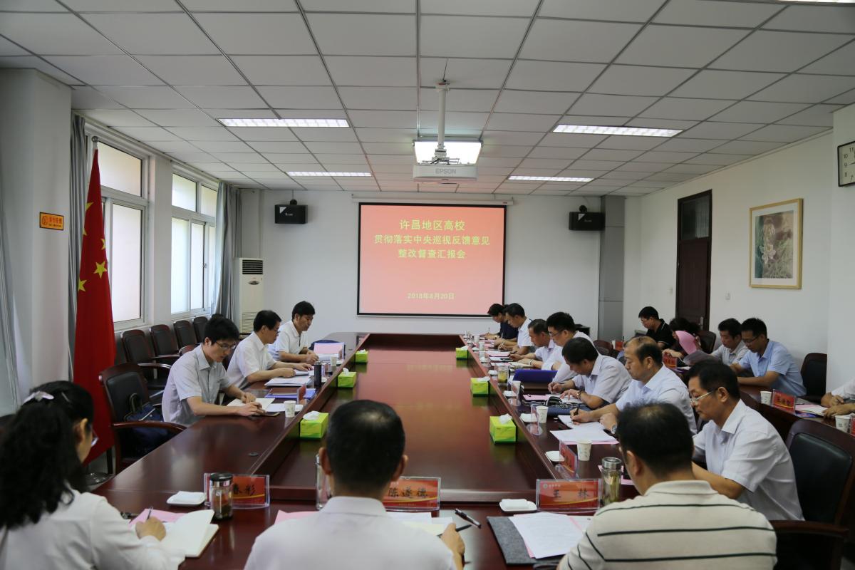 8月20日上午,许昌地区高校贯彻落实中央巡视反馈意见整改督查汇报会在金沙官网召开。省落实中央巡视反馈意见整改第三督查组在原河南理工大学党委书记王少安带领下出席会议。金沙2004路线js5、许昌职业技术学院、许昌电气职业学院、许昌陶瓷职业学院四所高校党委书记、副书记和相关职能部门及个别二级学院党总支书记参加了汇报会。汇报会由金沙官网副院长崔斌主持。