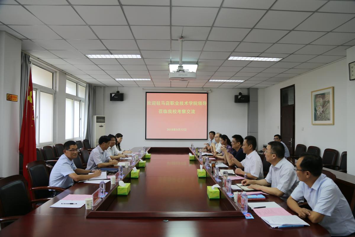 9月12日,驻马店职业技术学院党委书记宋大成、副书记刘贵文等一行5人来金沙官网考察交流。金沙官网党委书记闫纪建、副书记孙海会见了来访客人,党政办公室、党委组织部、党委宣传部、党委党校等部门负责同志参加了座谈交流。