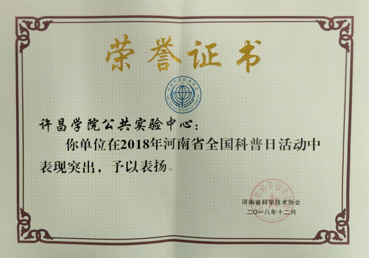 近日,河南省科协对2018年河南省全国科普日优秀组织单位、优秀活动以及个人进行了表彰。金沙官网公共实验中心荣获2018年河南省全国科普日活动先进单位,金沙2004路线js5科普全媒体传播中心创作基地科普开放日暨青少年影视科普教育体验活动荣获2018年河南省全国科普日活动优秀活动,刘雪锋老师荣获2018年河南省全国科普日先进个人。