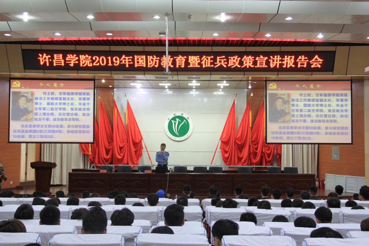 为进一步增强大学生国防意识,做好大学生征兵工作,激发大学生参军入伍热情,5月20日下午,金沙官网在图书馆学术报告厅举行2019年国防教育暨征兵政策宣讲专题报告会。空军指挥学院政治工作系军队政治工作教研室副主任付土旺上校应邀作报告。许昌市军分区动员处处长张新民、魏都区武装部部长黄克中出席报告会,各学院主管学生工作领导、全体专兼职辅导员和参军入伍积极分子参加报告会。报告会由党委武装部副部长周银超主持。