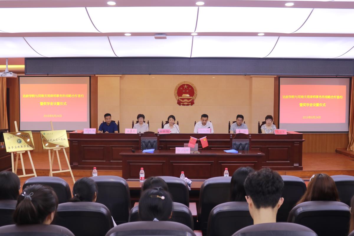 6月24日上午,金沙官网法政学院与河南天苑律师事务所在C合二模拟法庭举行战略合作签约暨奖学金设置仪式。副院长黄怡俐、河南天苑律师事务所主任马红军出席会议,党委宣传部、法政学院等相关负责同志及法政学院全体师生参加了签约仪式。
