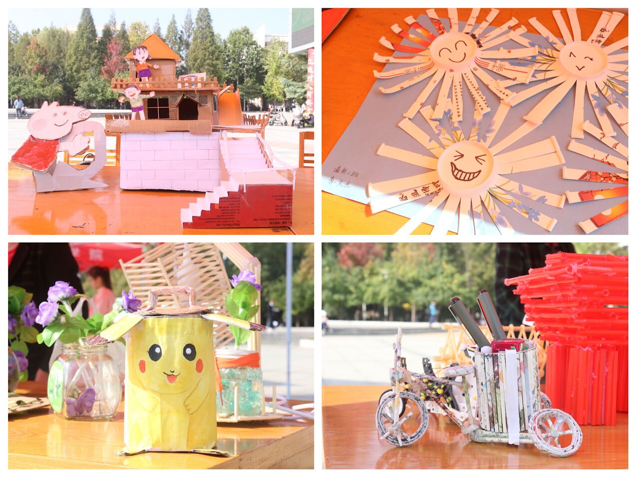 来自音乐舞蹈学院和国际教育学院的同学们用废报纸、塑料袋、旧窗纱,为大家带来了一场视觉盛宴,废弃的垃圾变身最时尚的“高定”服装,一场绚丽生动的时装表演赚足了眼球,原来“垃圾”还可以这样用;而来自教育科学学院、土木工程学院和电气(机电)工程学院的同学们也不甘示弱,废纸箱、雪糕棒、易拉罐、旧瓶盖在他们手中化身成为惟妙惟肖、趣味生动的轮船、飞机、笔筒、装饰灯和动物模型,吸引来往师生纷纷驻足欣赏。同学们用充满巧思的创意小物,为在校师生展示废旧物品再利用的方法和价值,带动广大师生树立节能环保意识,宣传绿色环保理念。