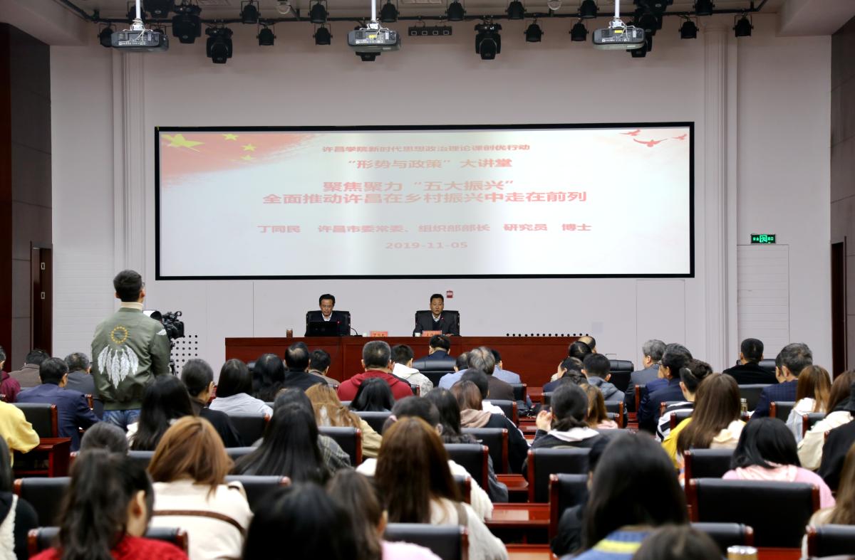 在专题形势政策报告会上,丁同民部长为广大师生作了一场内容丰富、数据详实的许昌“乡村振兴”方面的形势与政策报告。
