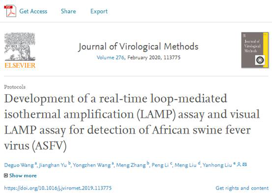 此外,以该检测方法为基础,金沙官网作为主要单位所起草的河南省地方标准《熟肉与熟肉制品中非洲猪瘟病毒核酸LAMP检测方法》已正式通过立项初审。相关研究成果以“Development of a real-time loop-mediated isothermal amplification (LAMP) assay and visual LAMP assay for detection of African swine fever virus (ASFV) ”为题,发表在国际学术SCI期刊Journal of Virological Methods。(https://doi.org/10.1016/j.jviromet.2019.113775)该研究工作得到国家重大科技专项(2016YFD0500704-4)的支持。